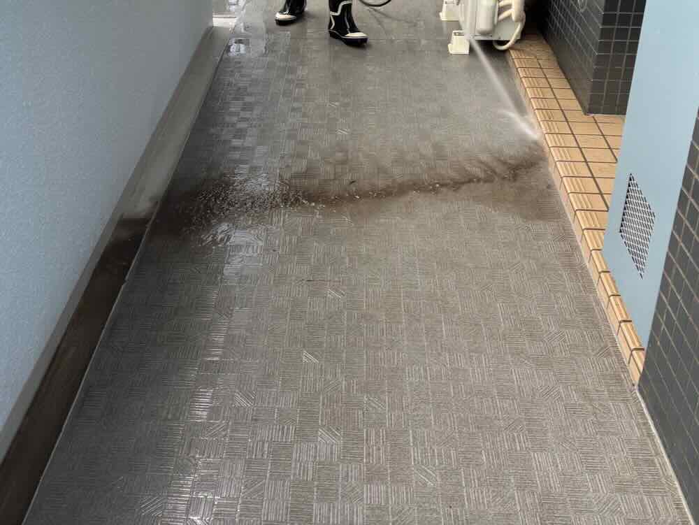 ガソリンエンジン式の高圧洗浄機を使用して、徹底的に床を綺麗にします。マンションは、モップがけではあまり綺麗にはなりません。定期的な高圧洗浄が必要になります。