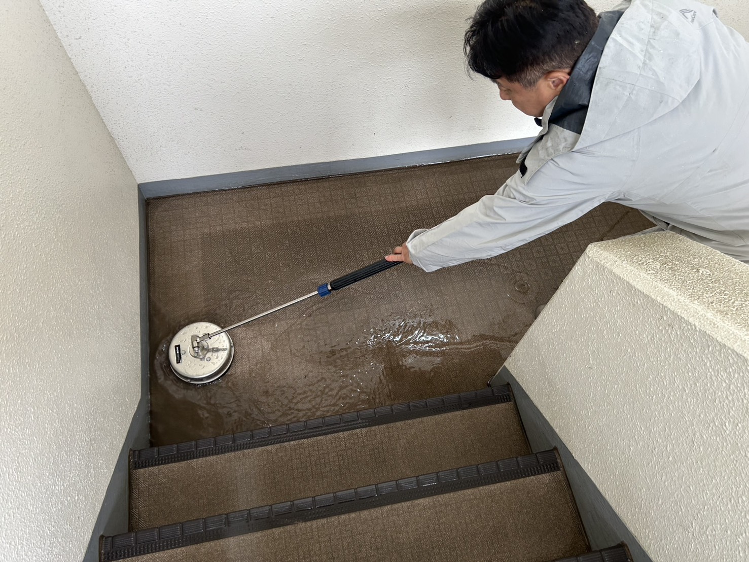 ガソリン式の高圧洗浄機、数種類のサーフェスクリーナーをご用意して、マンション様の共用部分の定期清掃を短時間で、行うことが可能です。